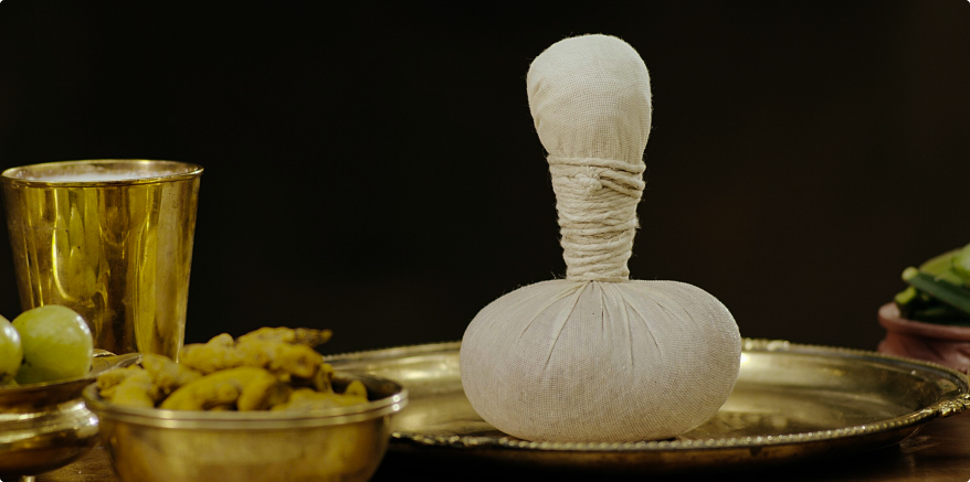 The body is massaged with the “potalis” (cloth bags) made from fried leaves of medicinal plants after dipping it in warm oil.